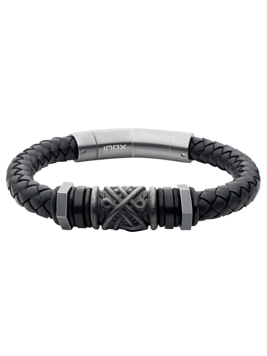 A men’s bracelet crafted from black full-grain leather with a braided design and gunmetal-tone